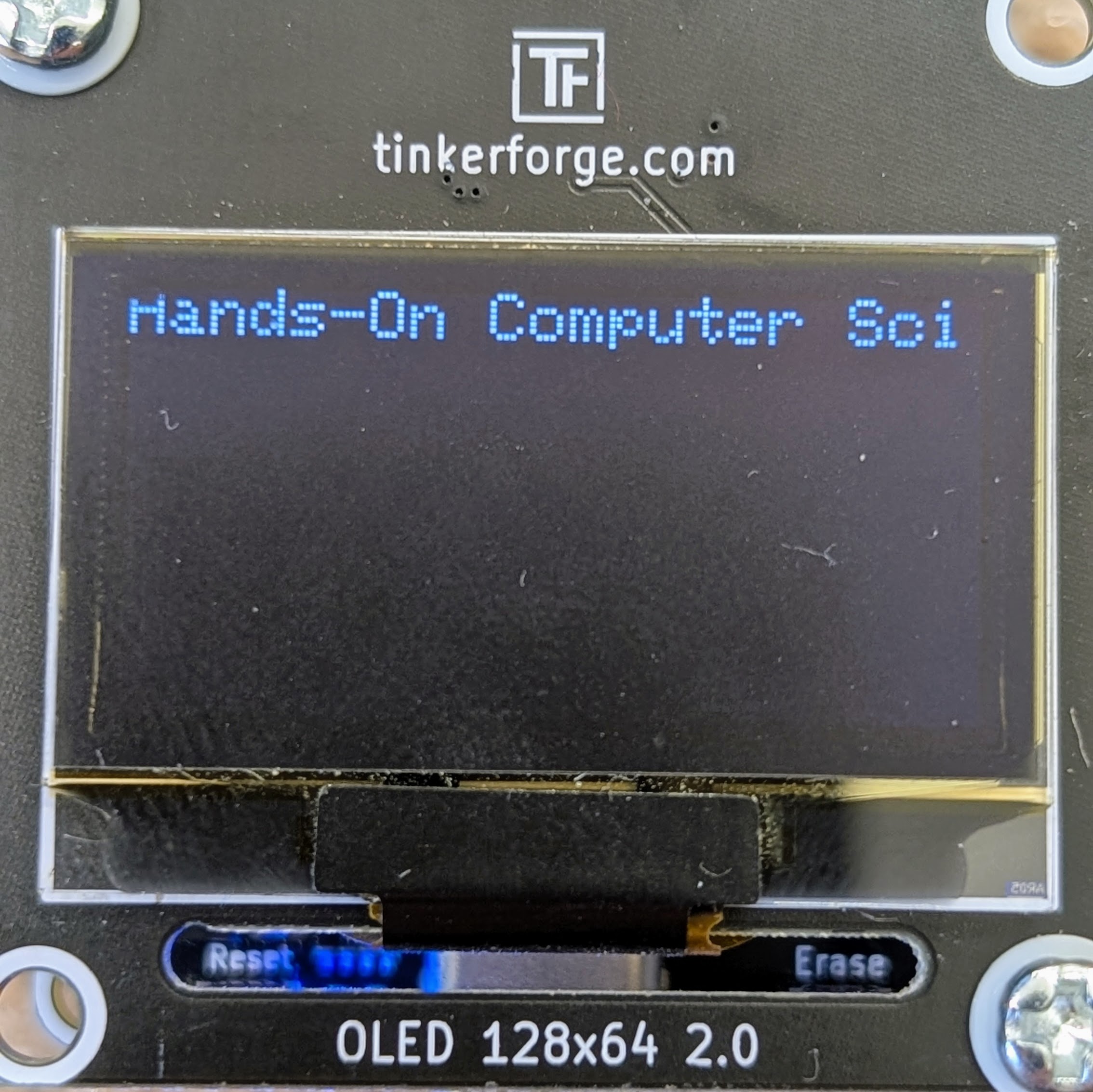 In Abbildung 4.4 könnt ihr den Unterschied zwischen meinem kläglichen Versuch, den Titel des Buches mit der Maus zu zeichnen, und der automatischen Textausgabe sehen. Das Display ist zwar nicht besonders groß, aber für einfache Grafiken und Texte reicht es allemal. Der Text “Hands-On Computer Science” ist aber mit 25 Zeichen zu lang und wird daher abgeschnitten.
