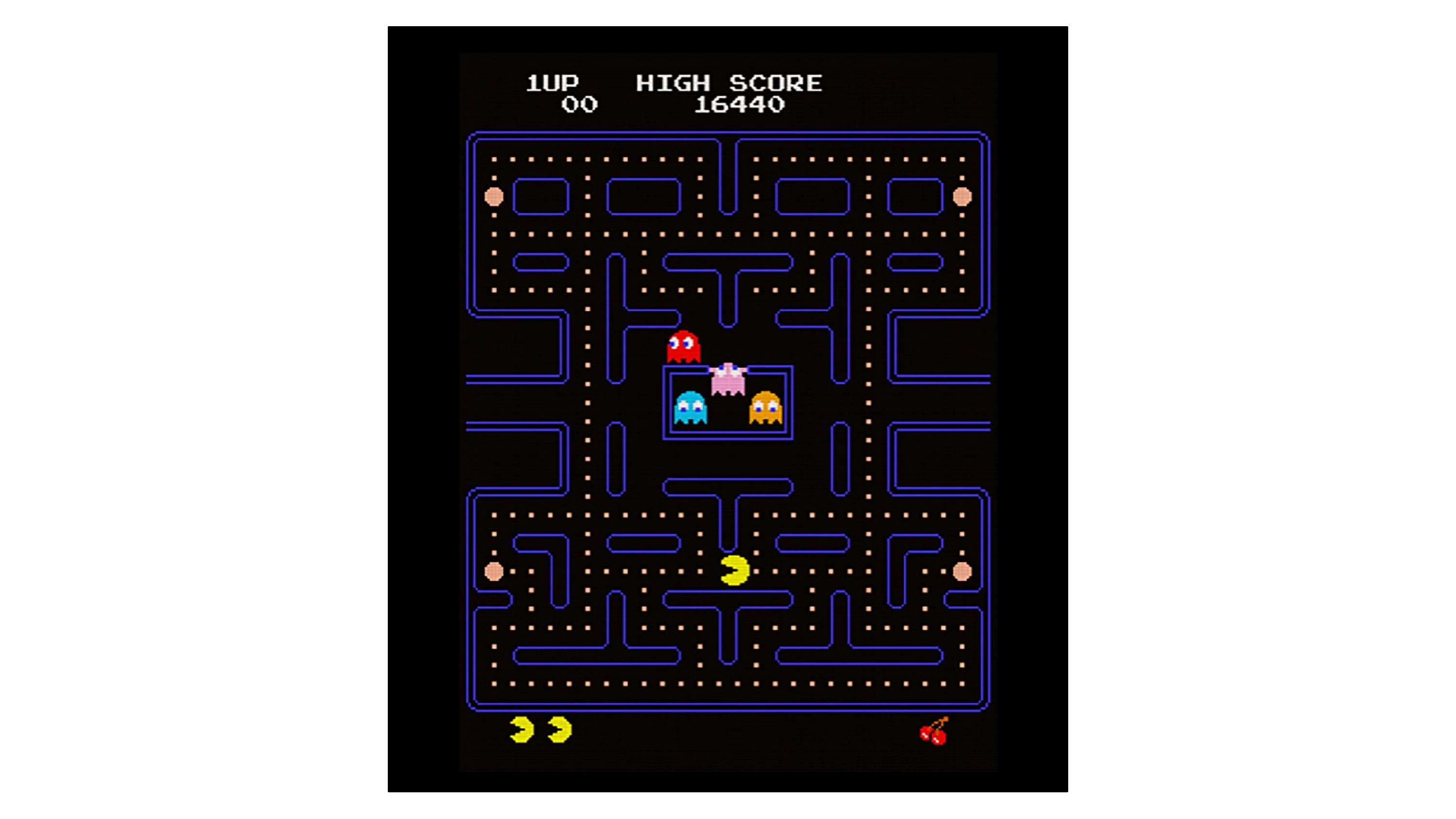 Das Spiel ist schnell erklärt. Pacman ist eine kreisförmige, gelbe Figur, die der Spieler durch ein Labyrinth steuert und dabei möglichst viele Punkte frisst. Währendessen wird Pacman von Geistern gejagt. Einen Eindruck vom Originalspiel seht ihr in Abbildung 4.28.