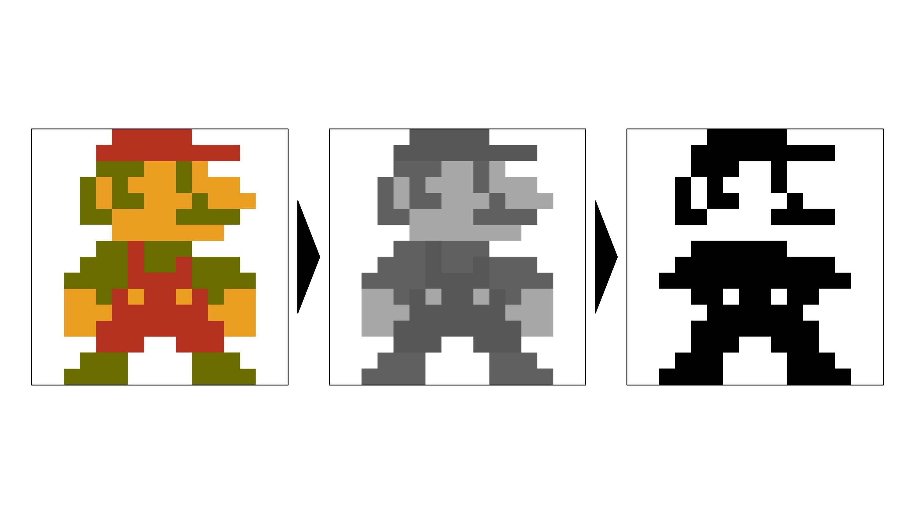 Mario ist am Ende zwar noch erkennbar, aber viele Details sind verloren gegangen. Besonders die seine Haut ist jetzt weiß und setzt sich nicht mehr vom Hintergrund ab. Wir könnten mit dem Schwellenwert experimentieren, aber mit nur zwei Farben bleibt die Darstellungsqualität stark begrenzt.