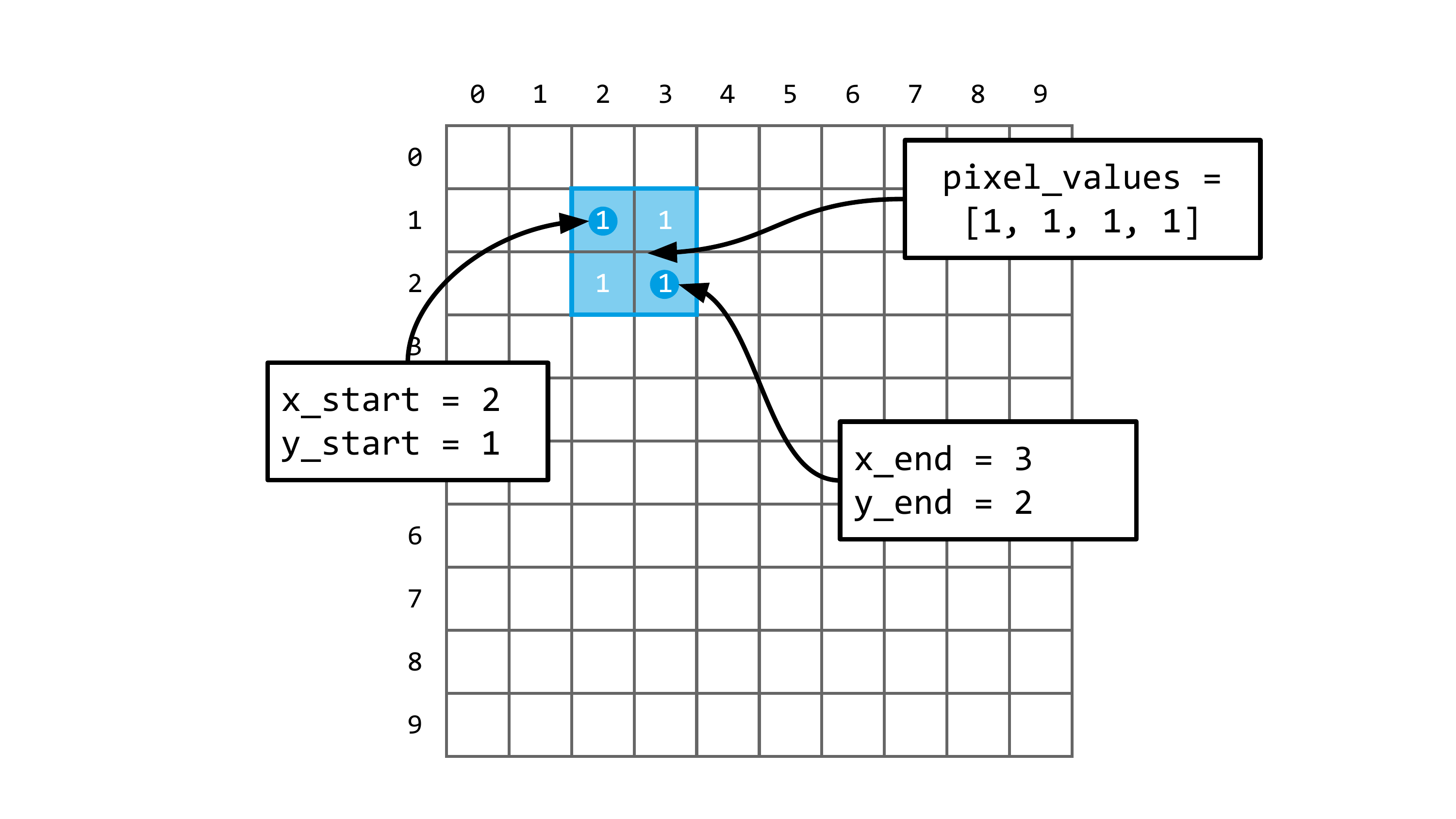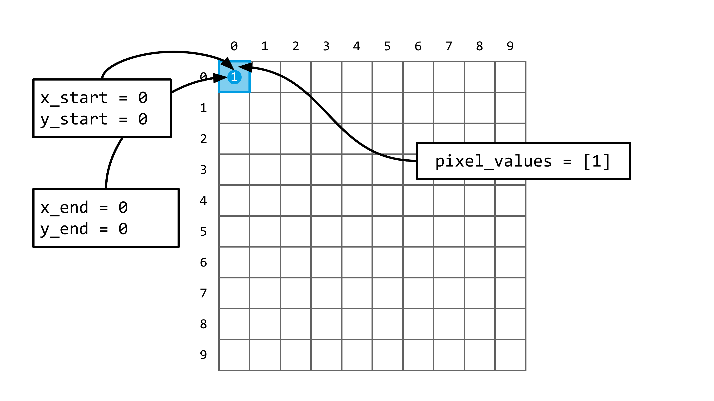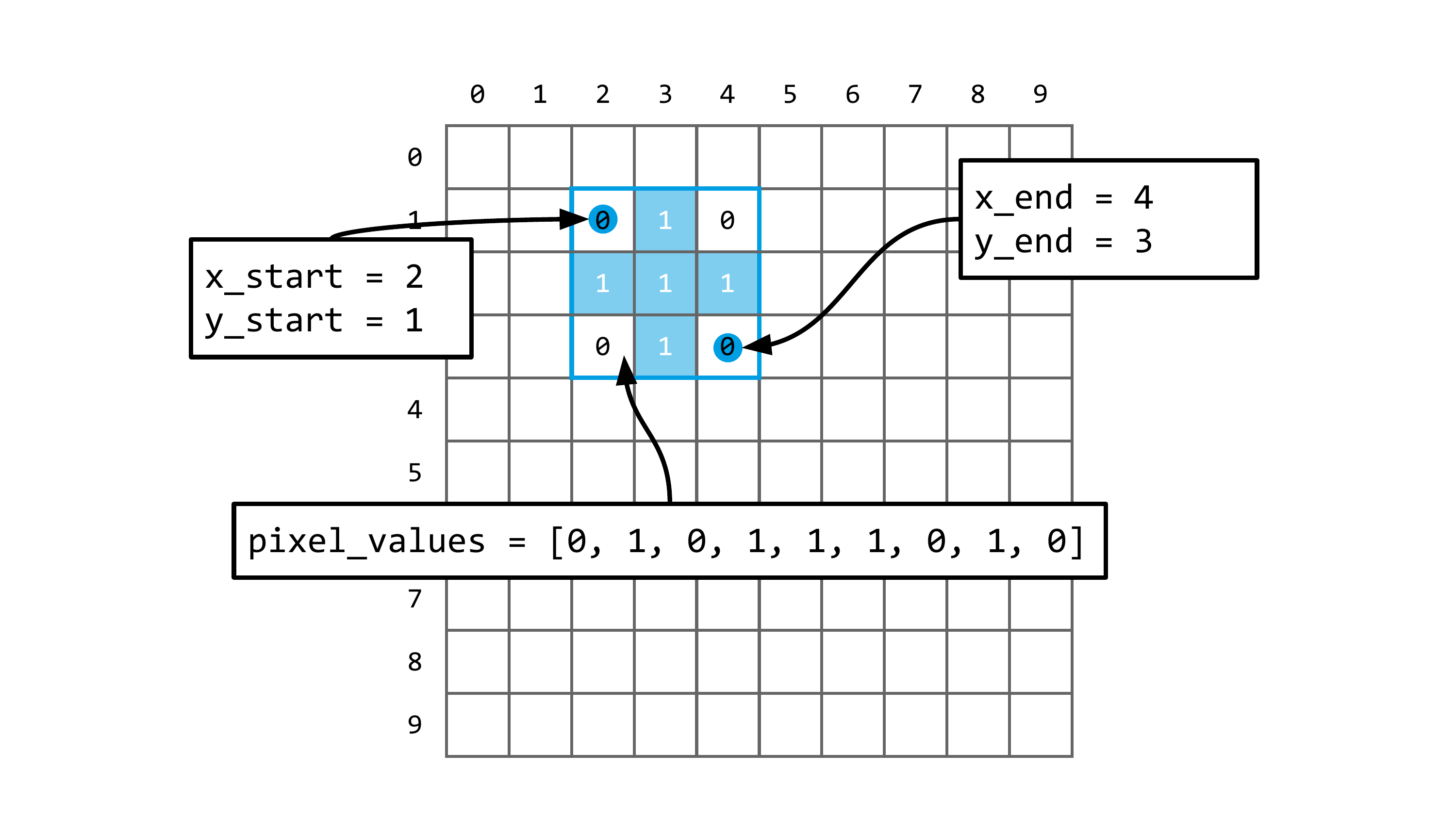 write_pixels(x_start, y_start, x_end, y_end, pixel_values)Die ersten vier Argumente definieren die zwei Eckpunkte des Rechtecks: oben links und unten rechts (beide inklusive). Die Breite ergibt sich aus x_end - x_start + 1, die Höhe aus y_end - y_start + 1.